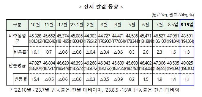 û 翡 , 8 15 Ұ 1.3% 48,591/20kg ̸, ܼ δ 49,025/20kg̴.